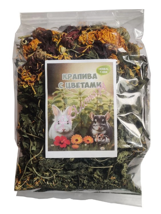 «Крапива с цветами календулы и гибискуса» — это натуральная витаминная добавка, созданная для здоровья и разнообразия рациона вашего питомца. Основа смеси — тщательно высушенные листья и стебли крапивы, собранные в экологически чистых местах. Она служит природным источником витаминов и минералов для поддержания иммунитета и здоровой шерсти. Цветы календулы и гибискуса не только делают добавку визуально привлекательной, но и привносят дополнительную пользу и нежный аромат, обогащая привычное меню. Идеально подходит в качестве полезной добавки к основному корму для шиншилл, кроликов, дегу и морских свинок. Состав: Крапива с цветами календулы и гибискуса